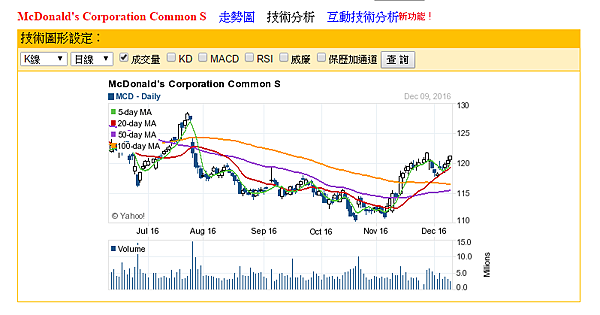 由該股K線看來,雖然看似前期整體趨勢往下走,但是可看出近來又拉高,我認為麥當勞在去年關閉全球許多表現不好的分店,並且在亞洲大幅改為特許經營權的做法,幫總公司省去人事成本上漲的風險,以及將體質不良的分店關閉,或是賣出,皆幫助公司營收有所成長,並且其在亞洲市場經營方式,廣告宣傳漸漸扭轉其在父母心中的速食不健康形象,十分成功,因此我認為在半年內其股價看漲。