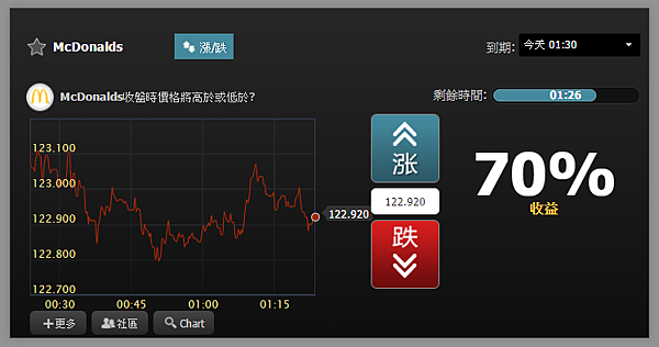 二元期權 的概念,就是把一張非常昂貴的股票,入門投資門檻降低,投資單位最低為25美金,相較於12,126美金平易近人許多,透過預測該股走向漲跌,以時間區間設定,最短能在5分鐘內得到交易收成,長則半年。相較購買一張完整股票, 二元期權 是個收成快,且適合小額投資的好方法。