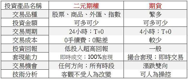 在二元期權交易標的資產中,包含有商品期或這一交易對象,但二元期權交易與期貨交易有哪些地方不一樣呢,金盛二元期權分析師用下方表格來比較,讓您深入了解兩者的差別。