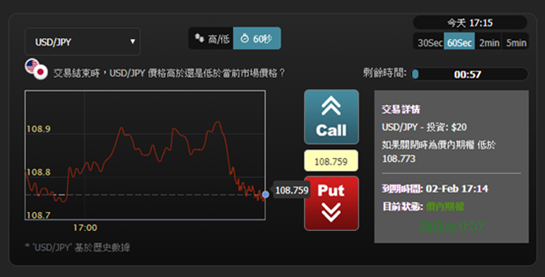 金盛期權平台以二元期權方式交易,此投資方式只需判斷標的物走勢方向是漲或跌,正確即可獲得高收益,其交易時間由投資人決定,可以選擇單筆交易要__分鐘或__小時結算,因此在趨勢明顯時,可以用較短的交易時間,達到一天多筆交易收入。